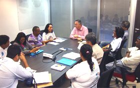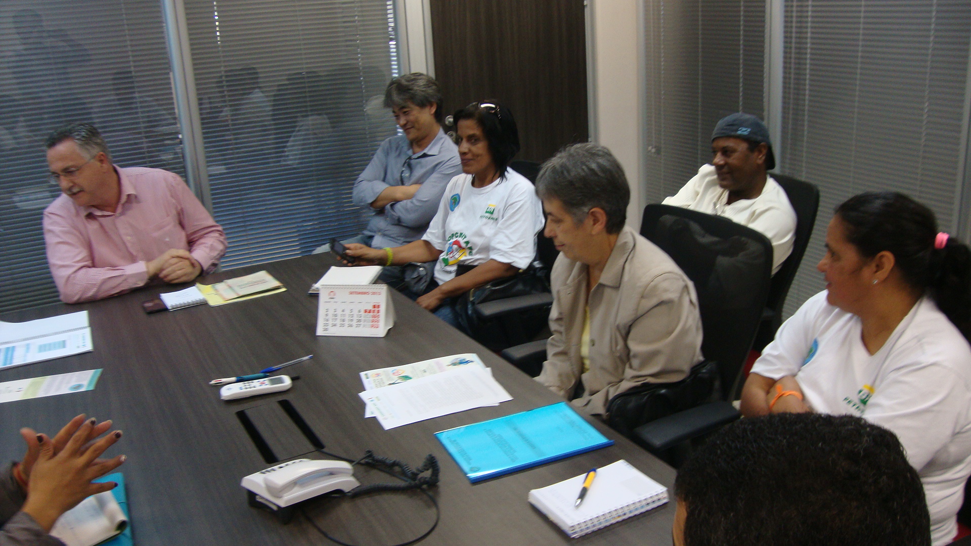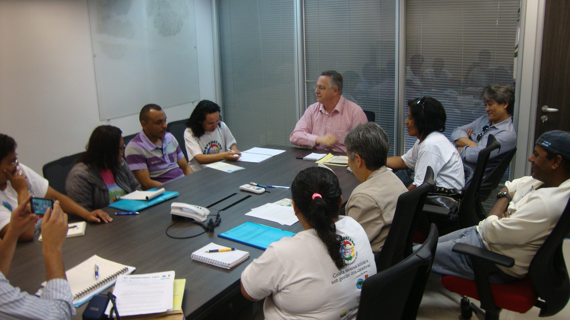 A catadora Joana Darc Pereira, presidente da Coopcent ABC, Cooperativa de segunda Grau que agrega as duas associações de catadores de São Bernardo, entre outras do Grande ABC, faz a entrega da proposta para o representante da Prefeitura, Tarcisio Secoli, Secretário de Serviços Urbanos, na reunião que contou também com a presença do diretor da Secretaria de Desenvolvimento Econômico, Trabalho e Turismo do Município Nilson Tadashi Oda e da Assessora da Coopcent ABC Maria Ruth Takahashi.