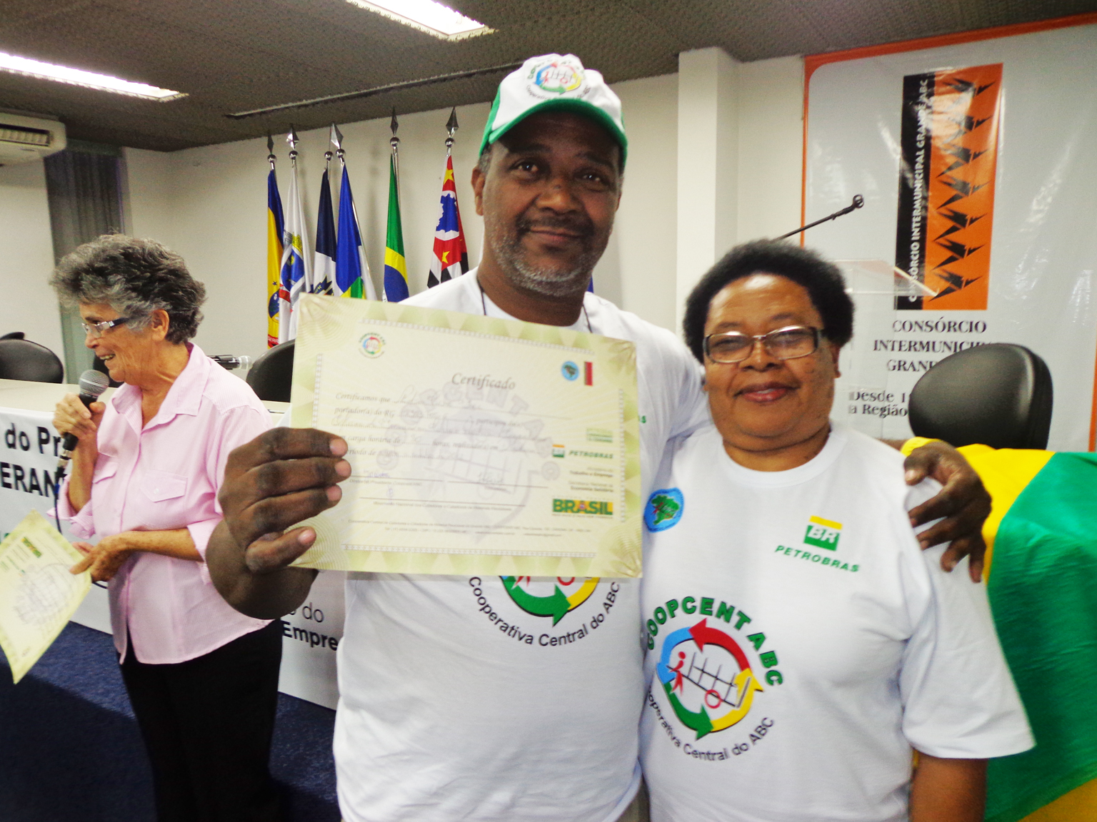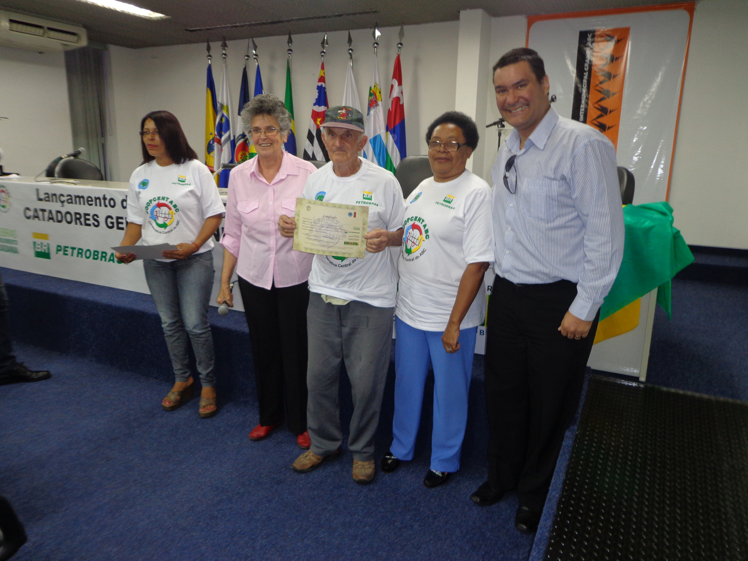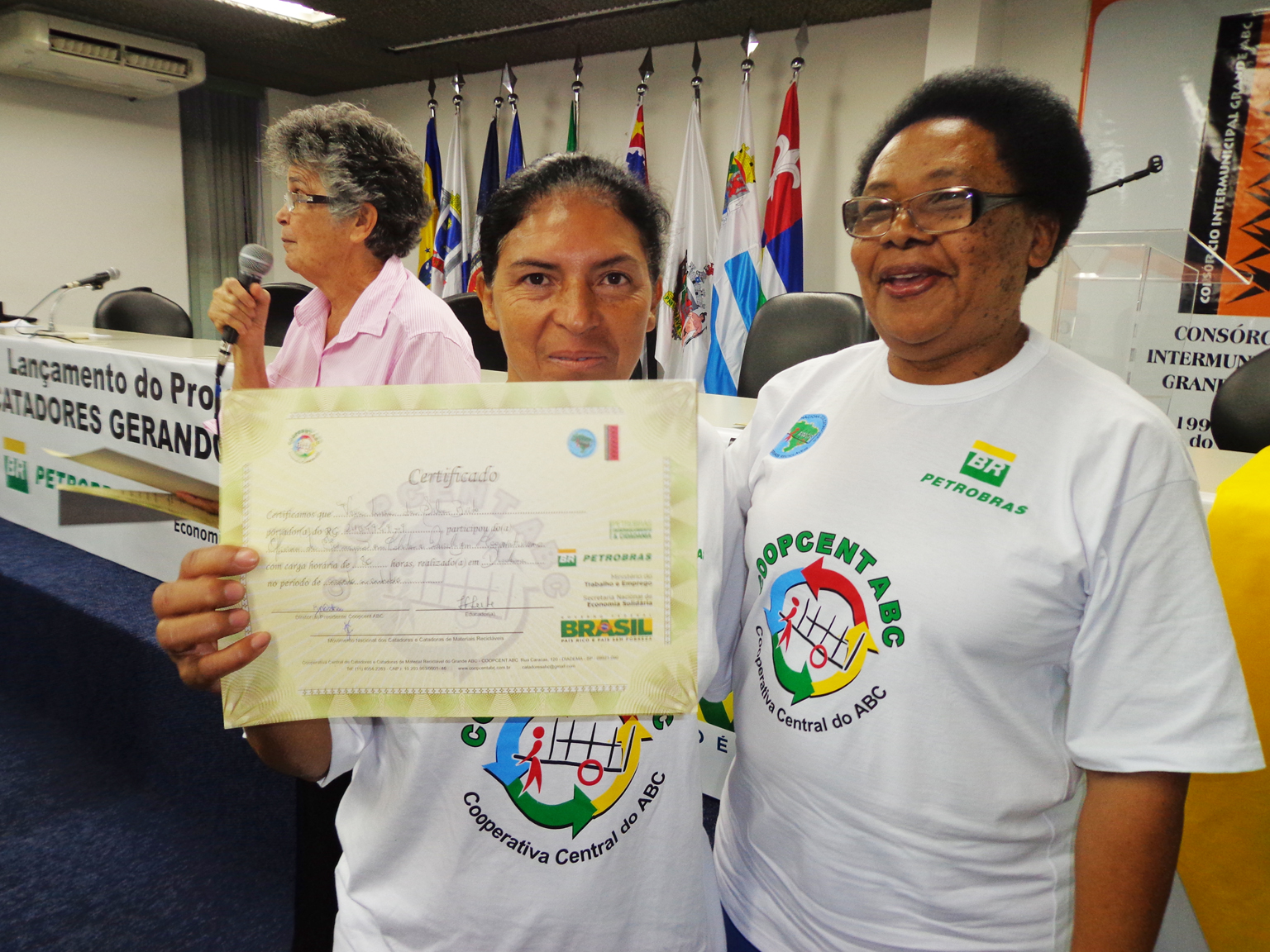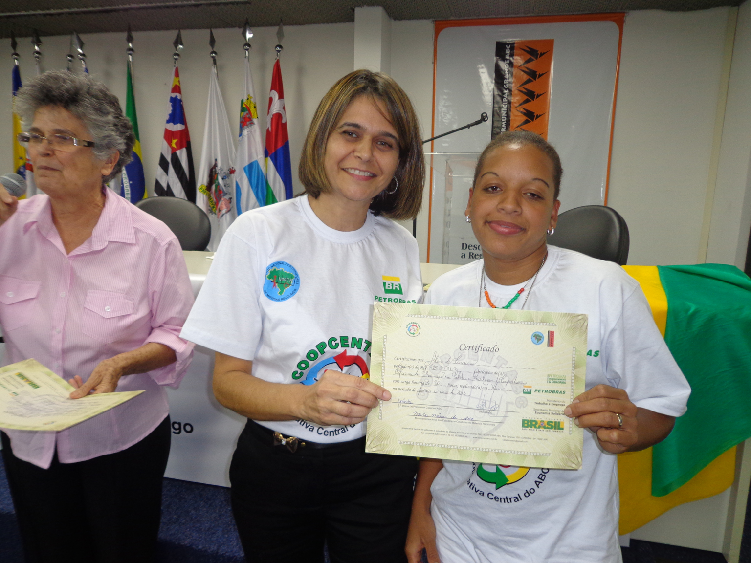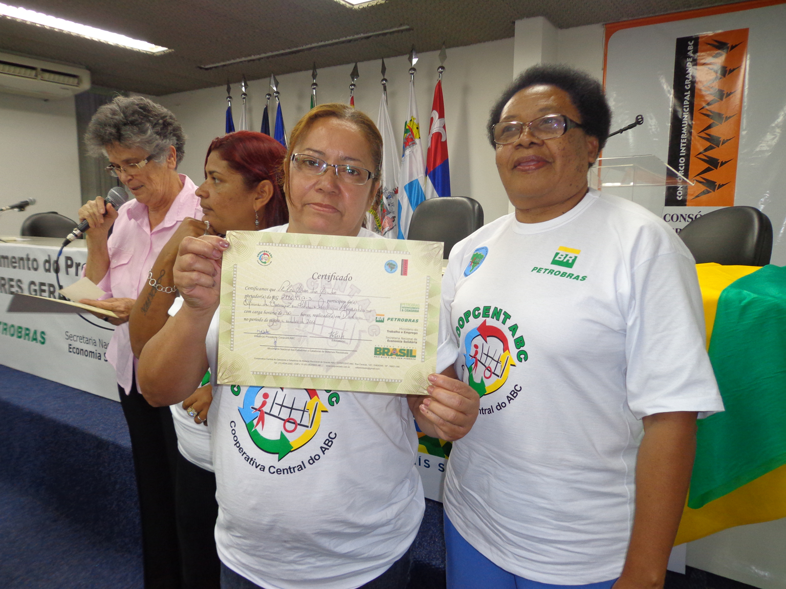 Na segunda parte do evento, foi realizada entrega de certificados a catadoras e catadores que participaram em 2012 e 2013 do Projeto "Fortalecimento dos Catadores e Catadoras e Ampliação da Coleta Seletiva no Grande ABC", realizado em parceria entre a Coopcent ABC, Secretaria Nacional de Economia Solidaria - SENAES e a Petrobras.