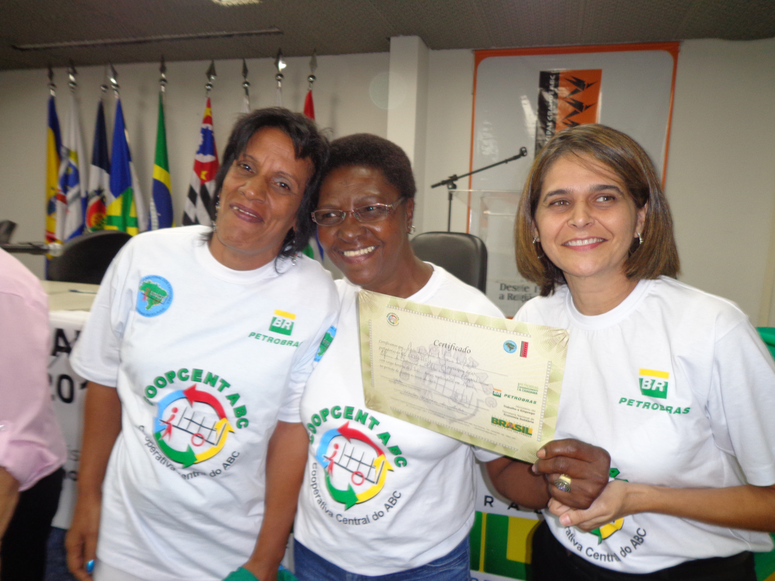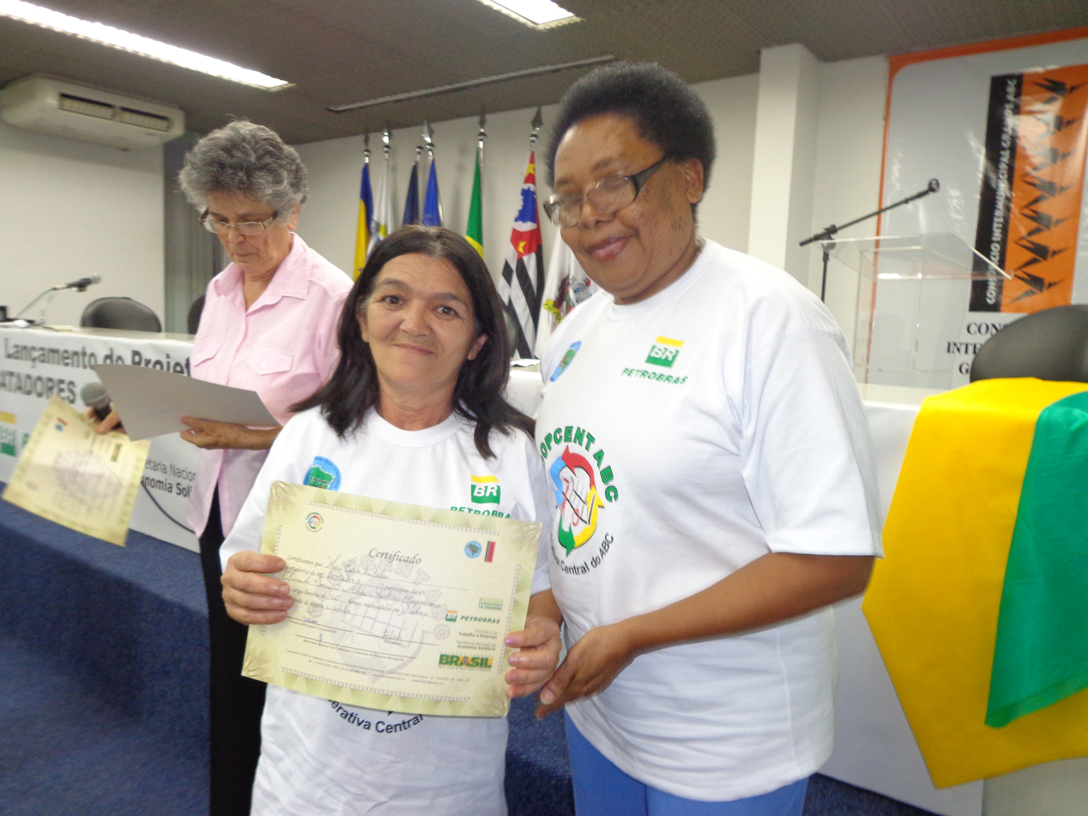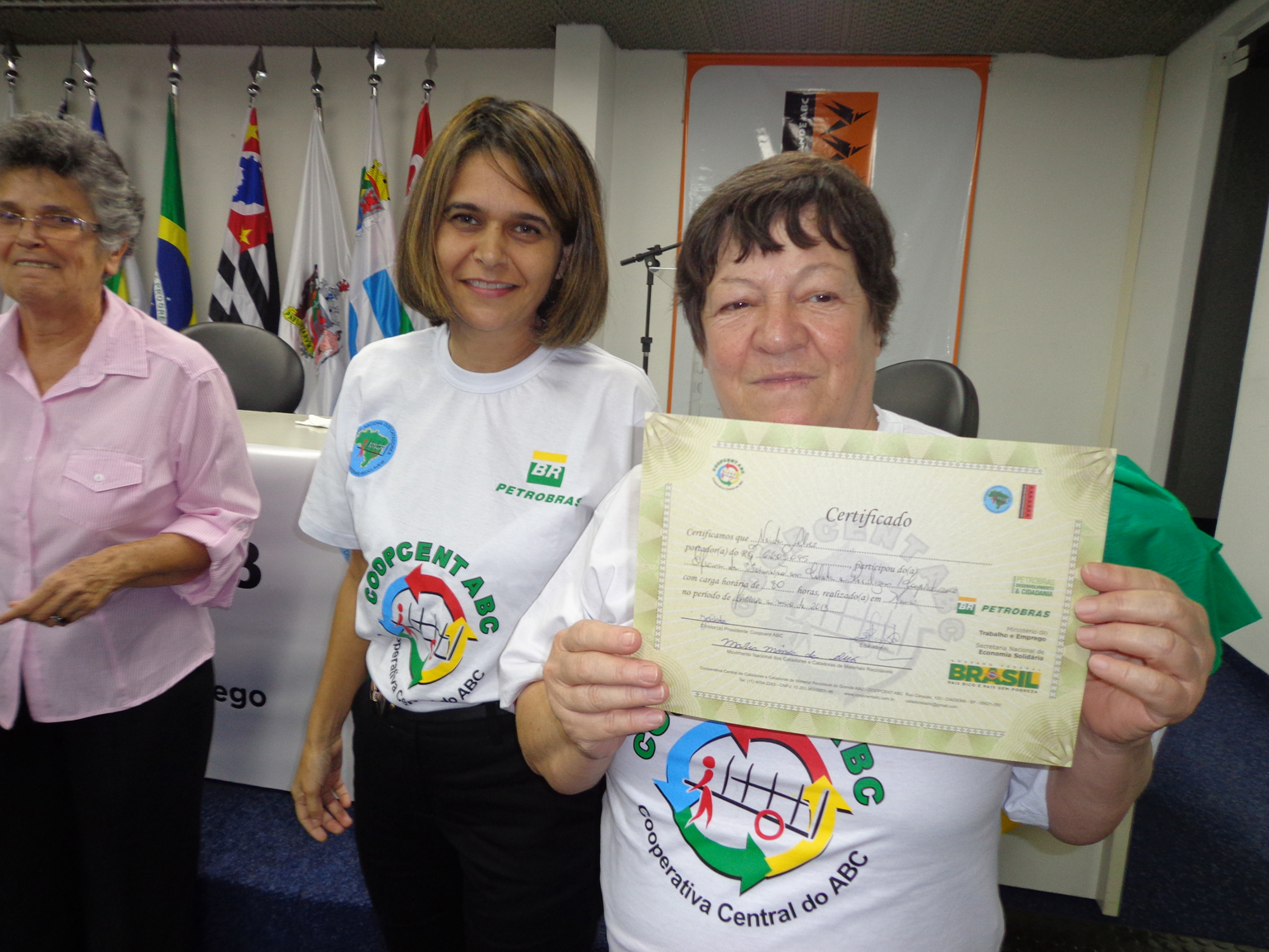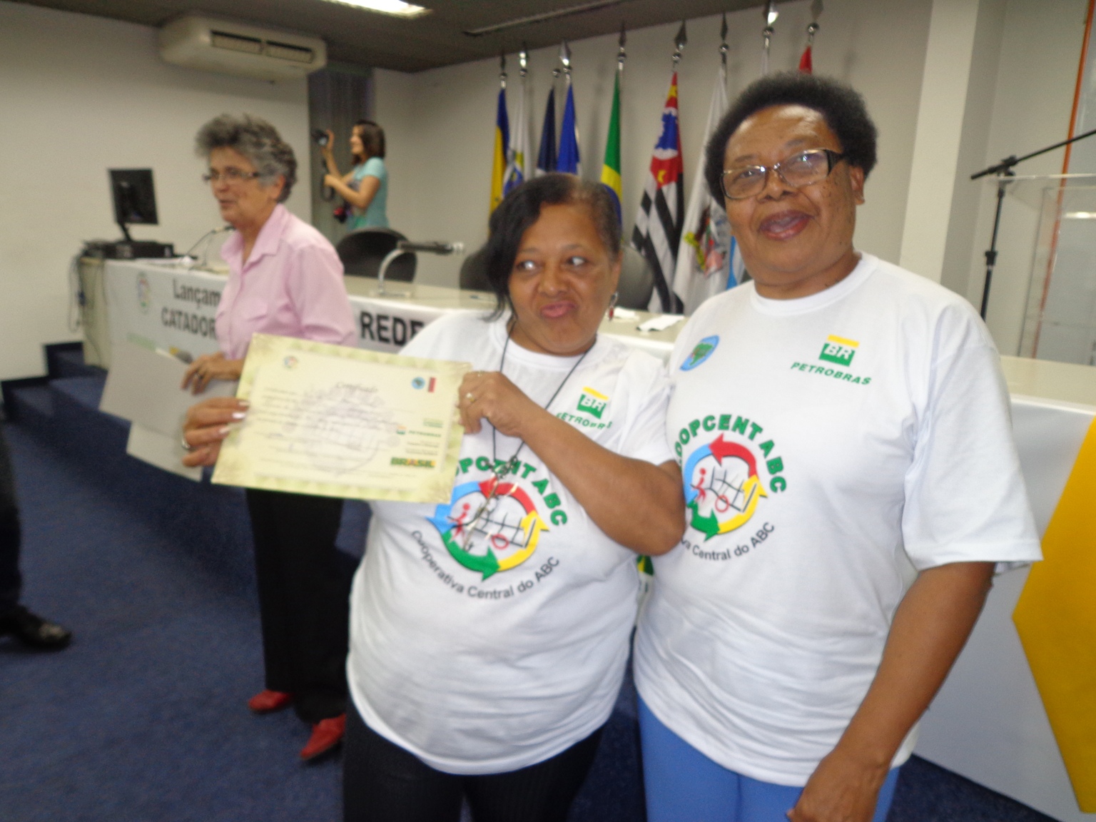 Na segunda parte do evento, foi realizada entrega de certificados a catadoras e catadores que participaram em 2012 e 2013 do Projeto "Fortalecimento dos Catadores e Catadoras e Ampliação da Coleta Seletiva no Grande ABC", realizado em parceria entre a Coopcent ABC, Secretaria Nacional de Economia Solidaria - SENAES e a Petrobras.