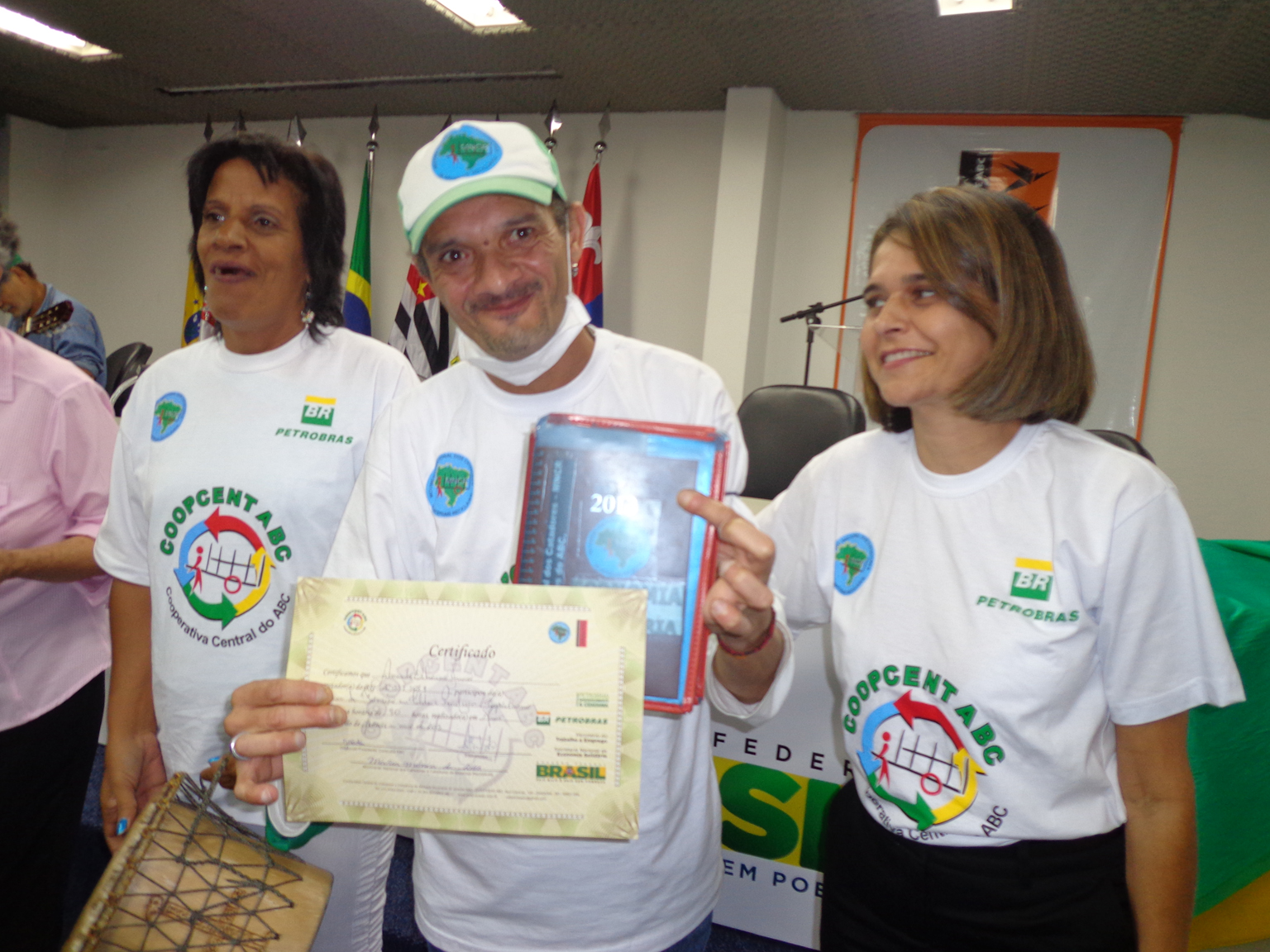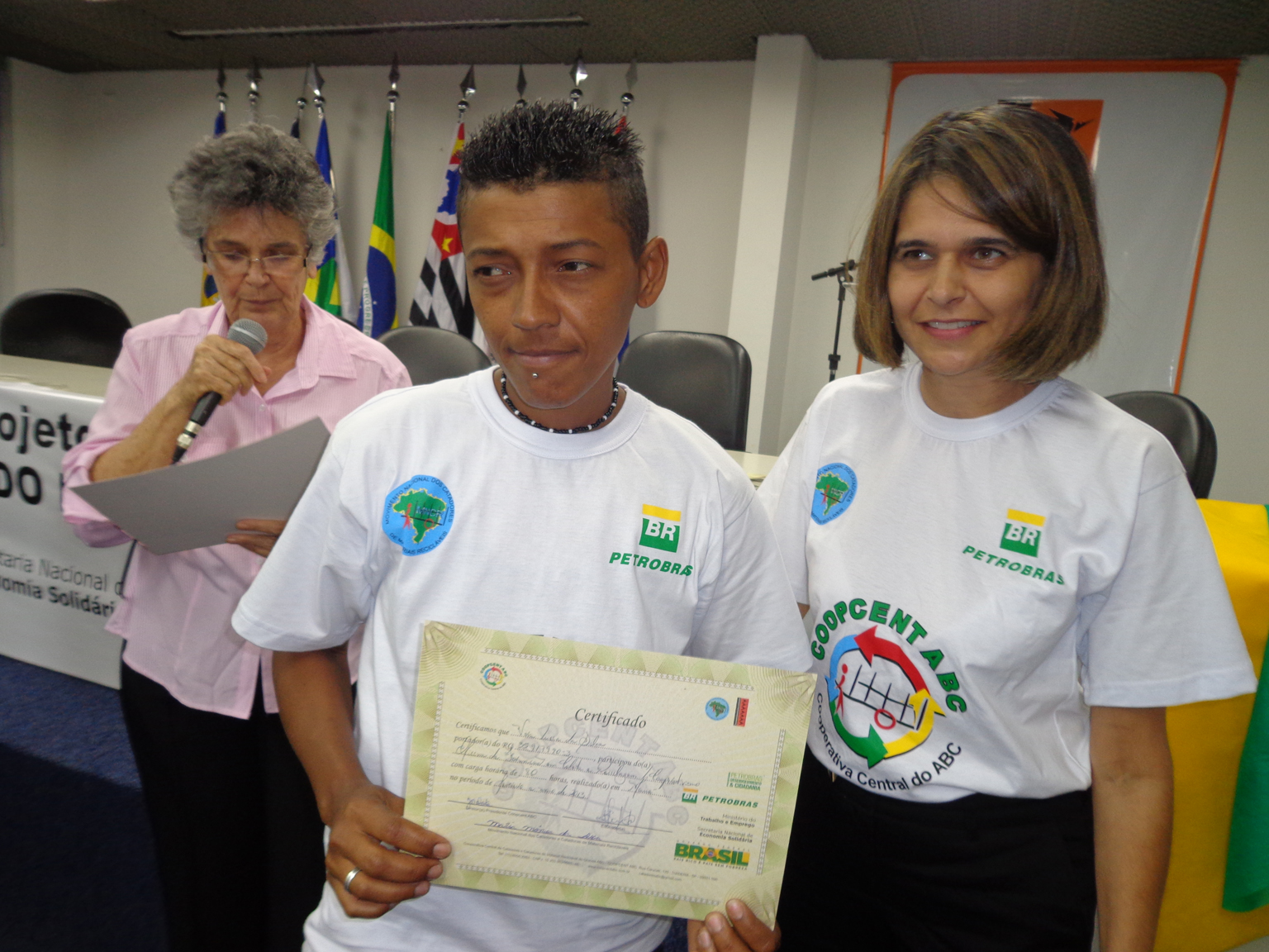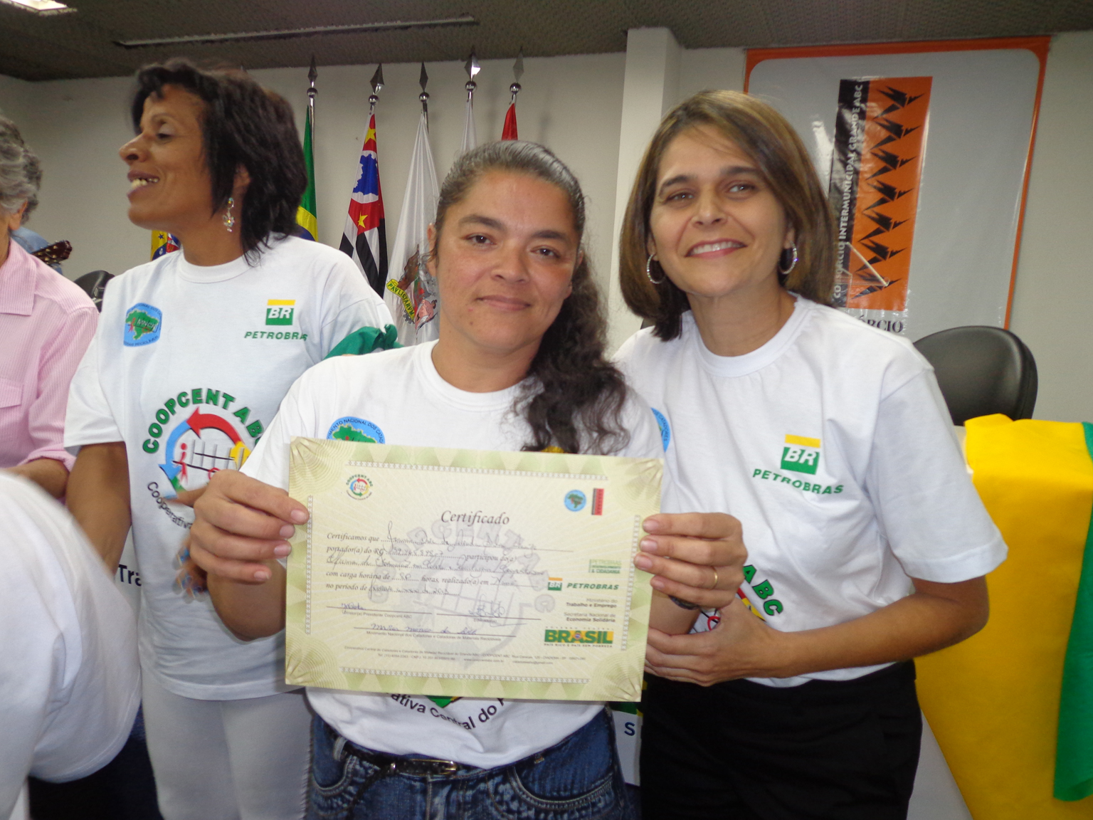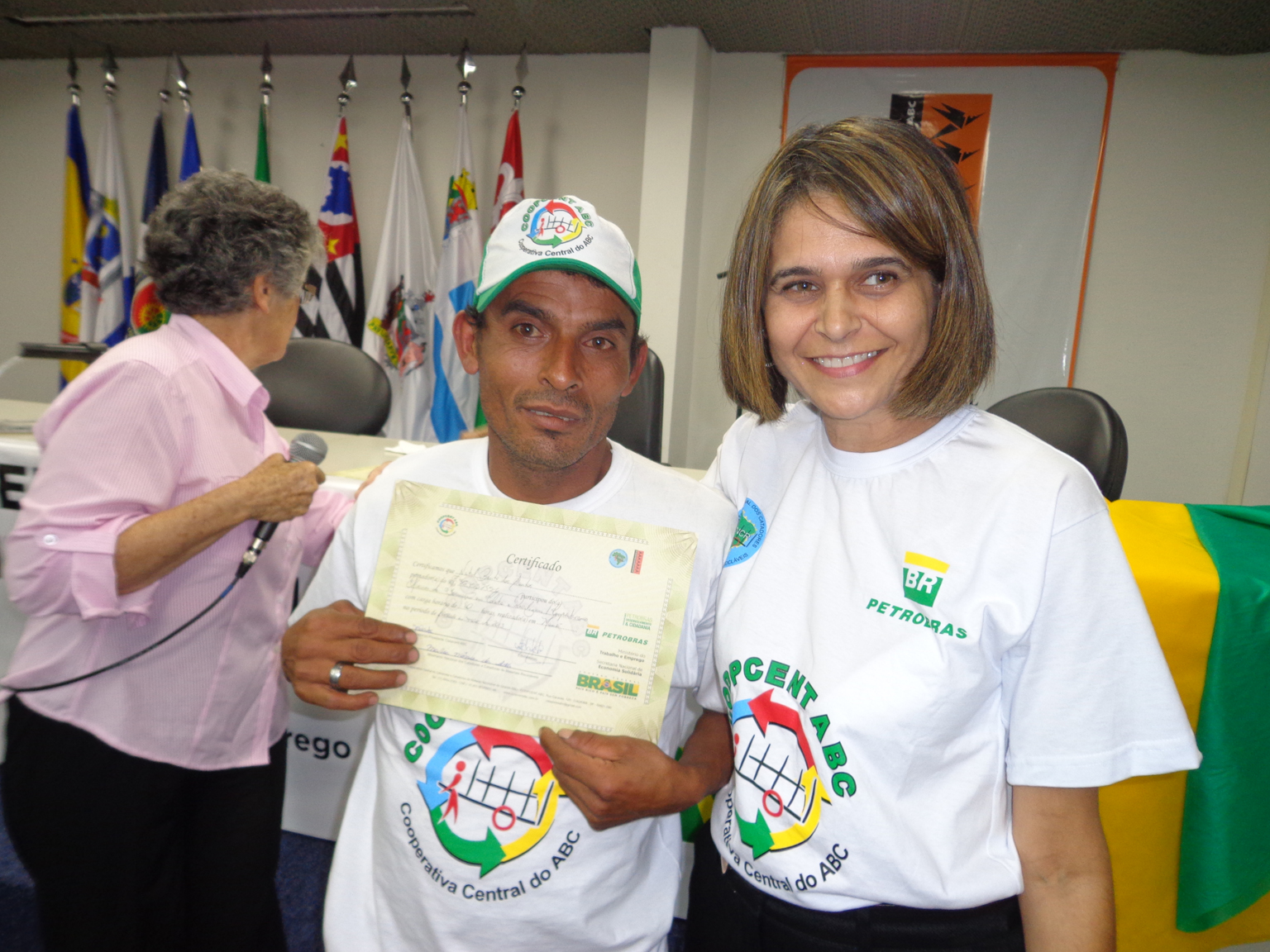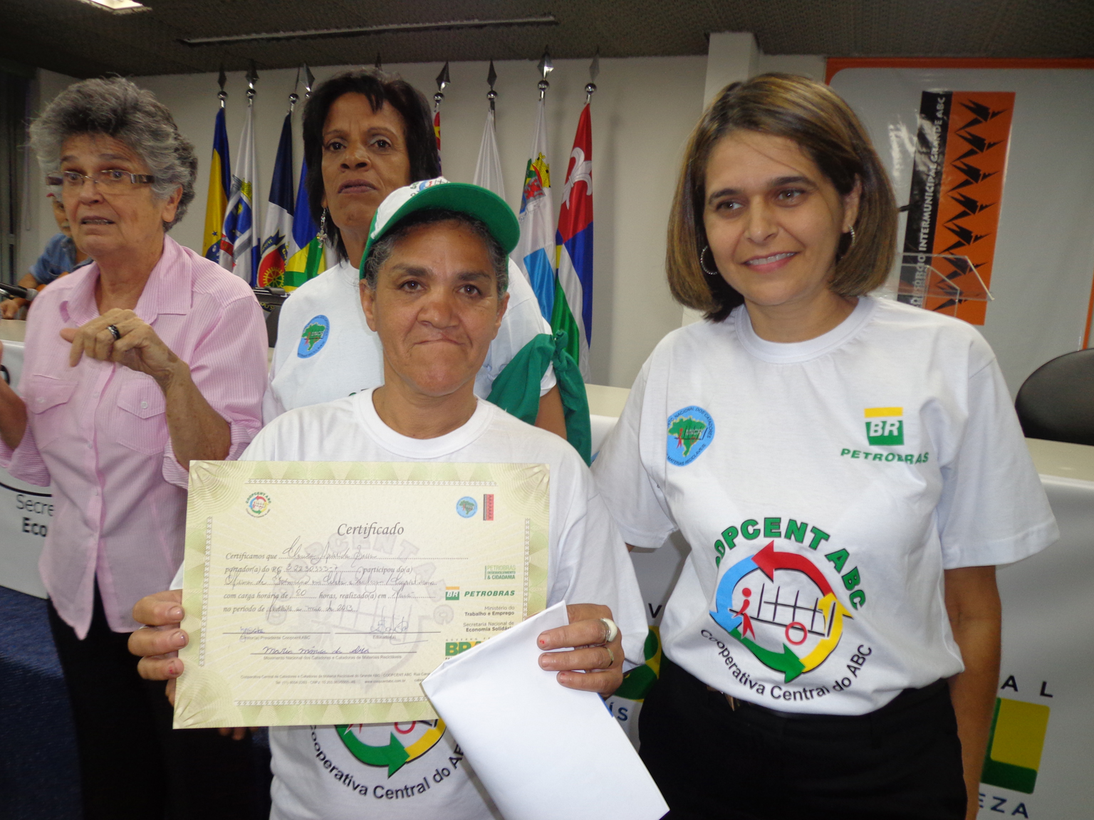 Na segunda parte do evento, foi realizada entrega de certificados a catadoras e catadores que participaram em 2012 e 2013 do Projeto "Fortalecimento dos Catadores e Catadoras e Ampliação da Coleta Seletiva no Grande ABC", realizado em parceria entre a Coopcent ABC, Secretaria Nacional de Economia Solidaria - SENAES e a Petrobras.