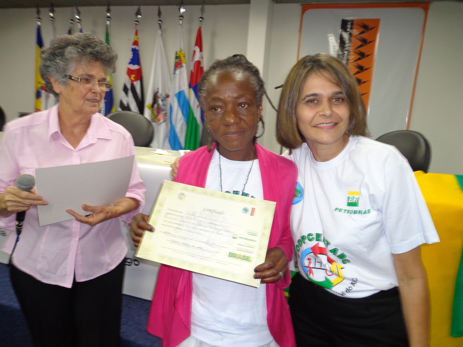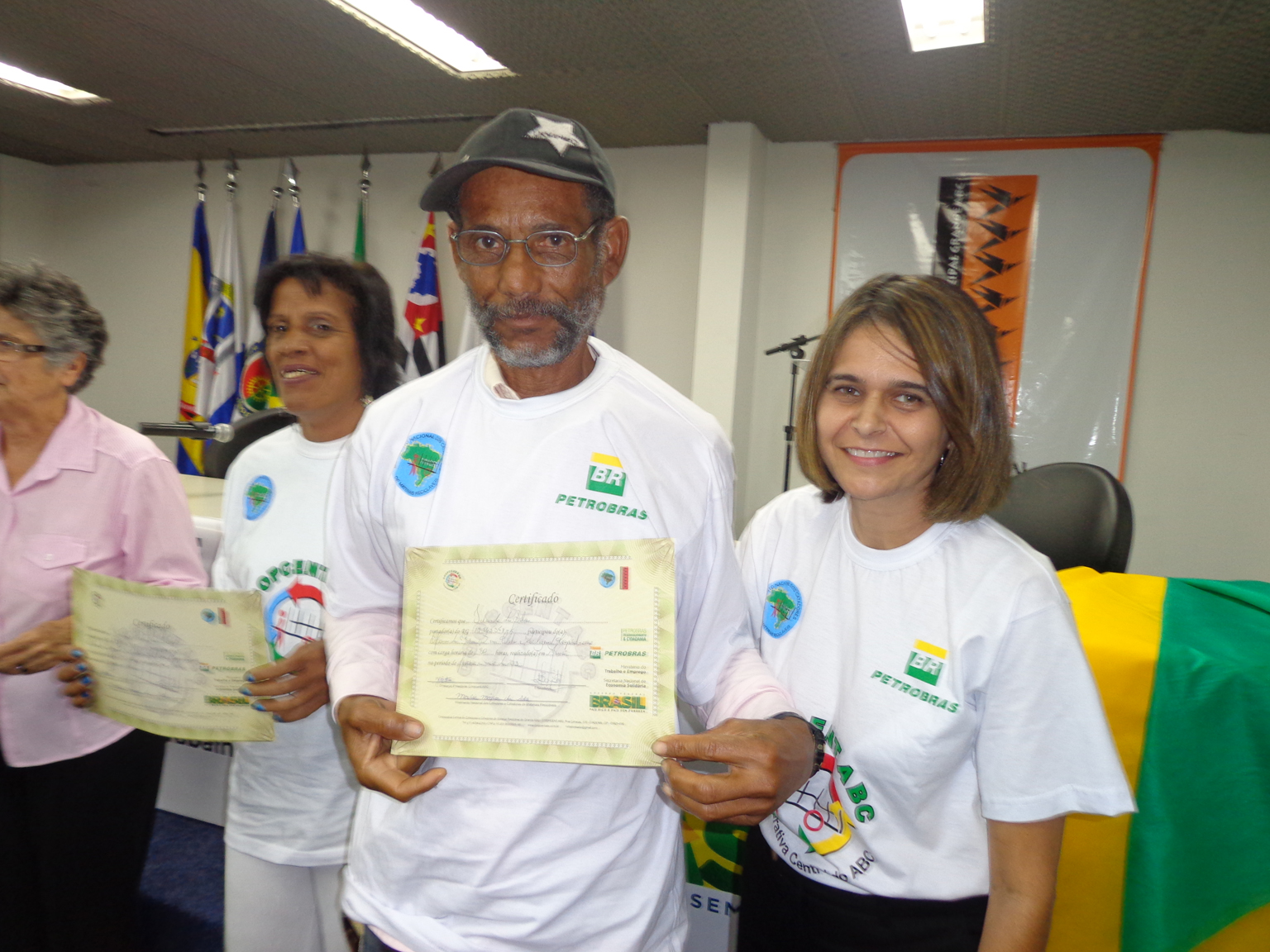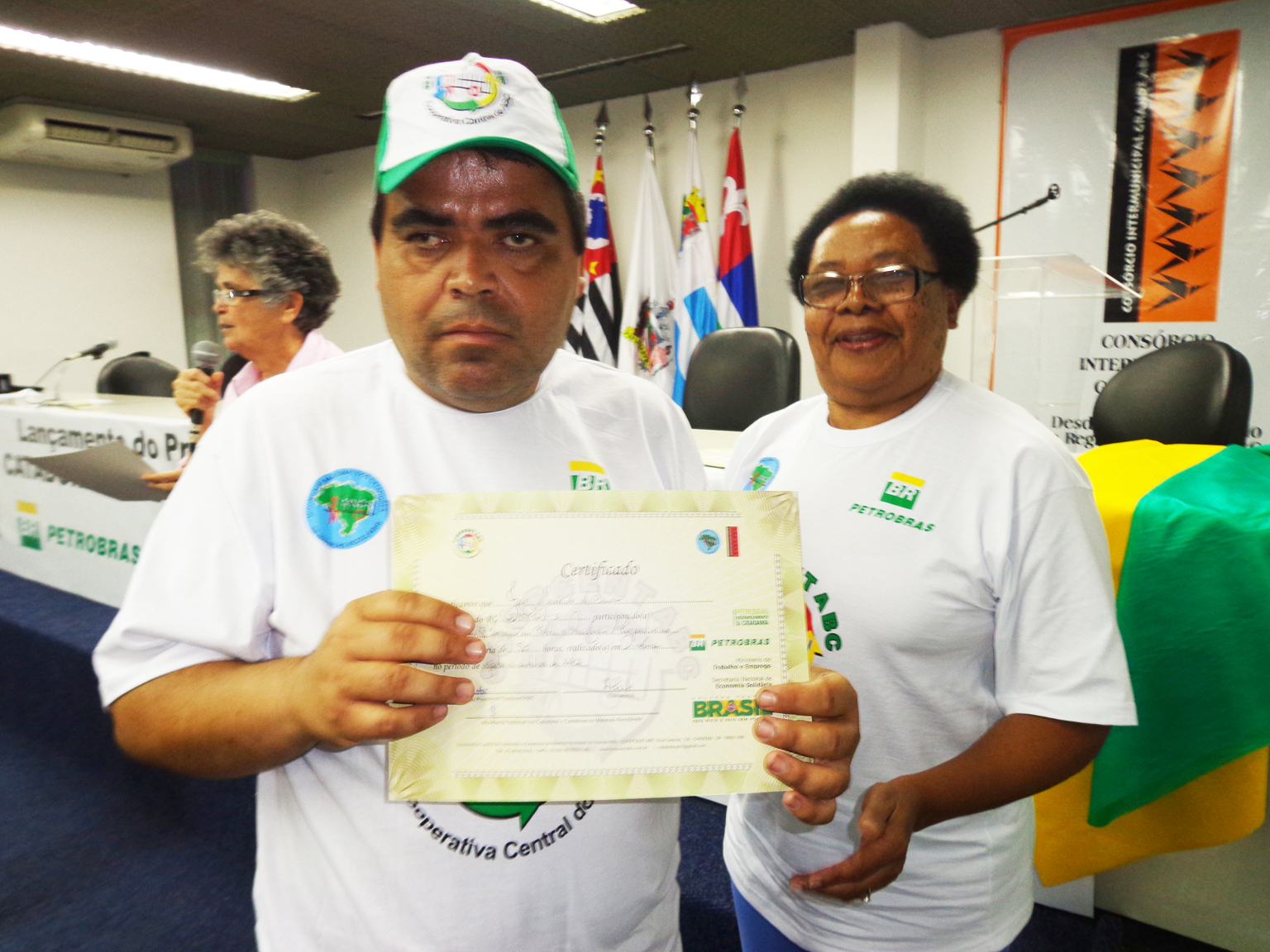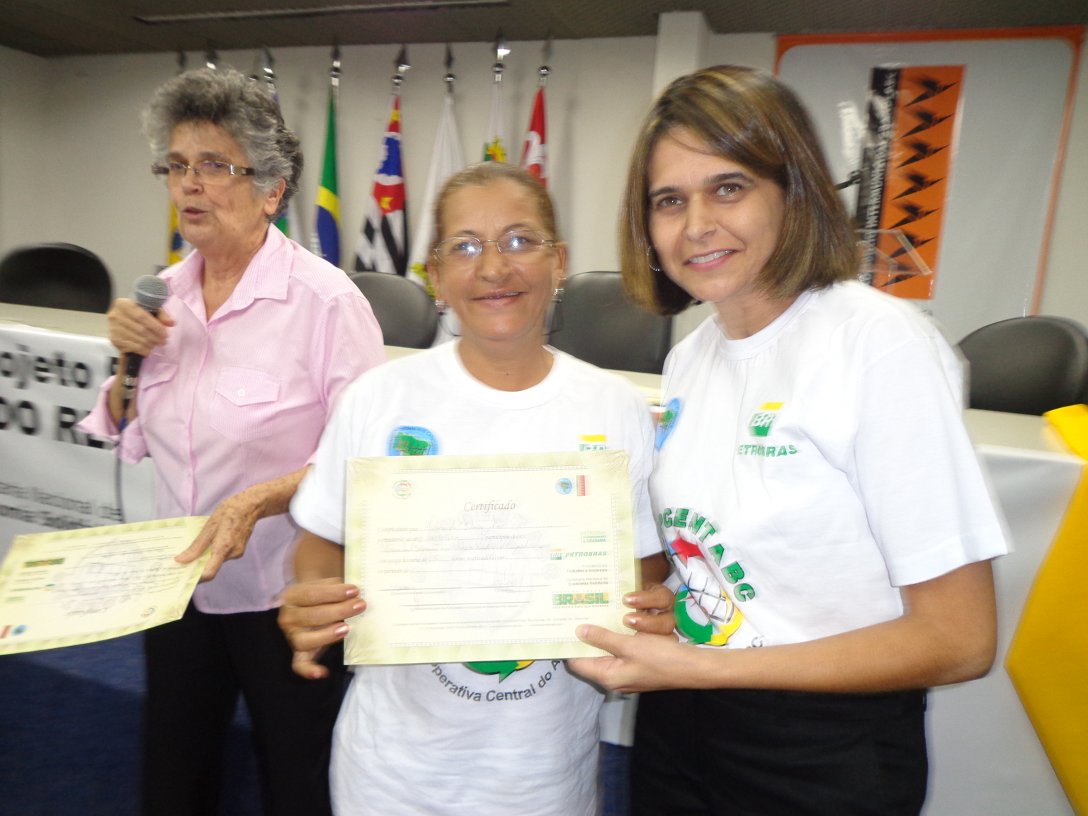 Na segunda parte do evento, foi realizada entrega de certificados a catadoras e catadores que participaram em 2012 e 2013 do Projeto "Fortalecimento dos Catadores e Catadoras e Ampliação da Coleta Seletiva no Grande ABC", realizado em parceria entre a Coopcent ABC, Secretaria Nacional de Economia Solidaria - SENAES e a Petrobras.