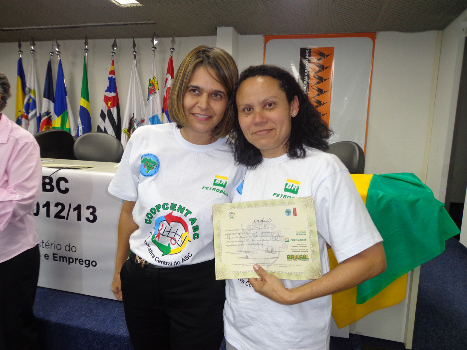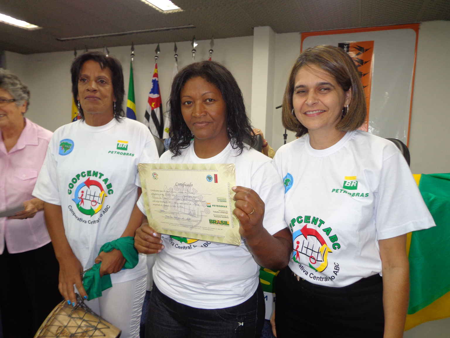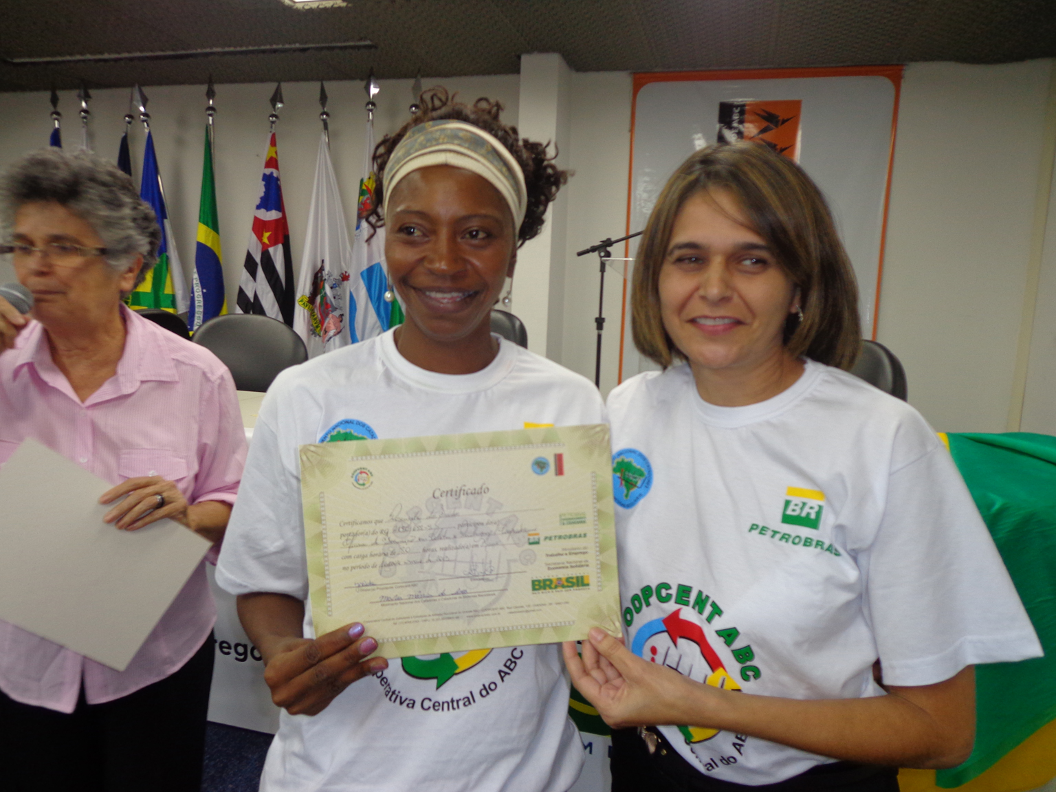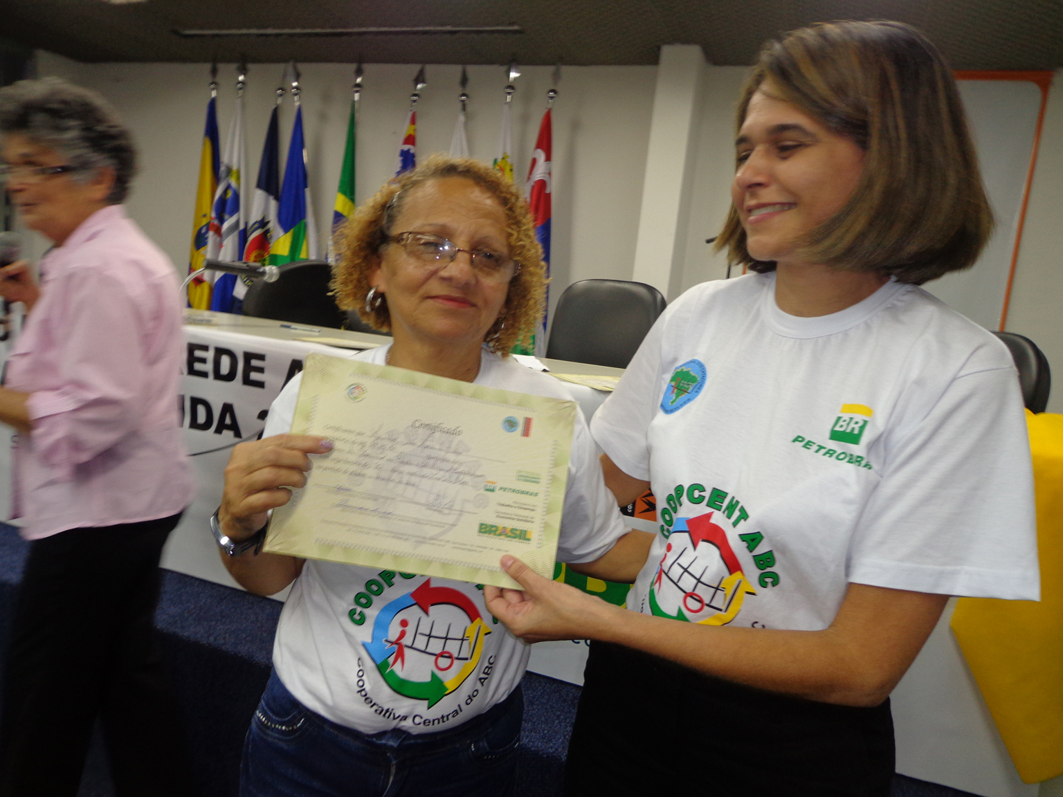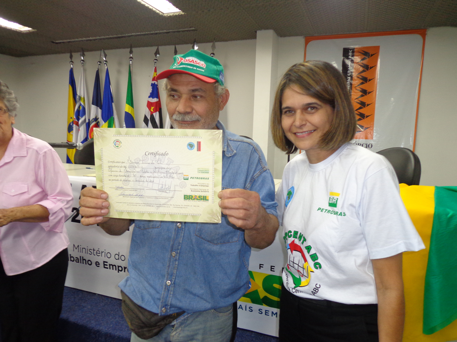 Na segunda parte do evento, foi realizada entrega de certificados a catadoras e catadores que participaram em 2012 e 2013 do Projeto "Fortalecimento dos Catadores e Catadoras e Ampliação da Coleta Seletiva no Grande ABC", realizado em parceria entre a Coopcent ABC, Secretaria Nacional de Economia Solidaria - SENAES e a Petrobras.